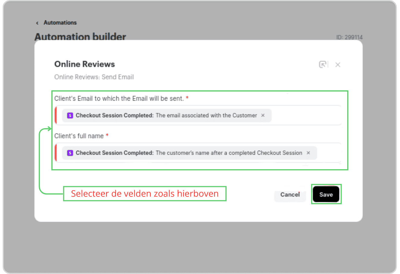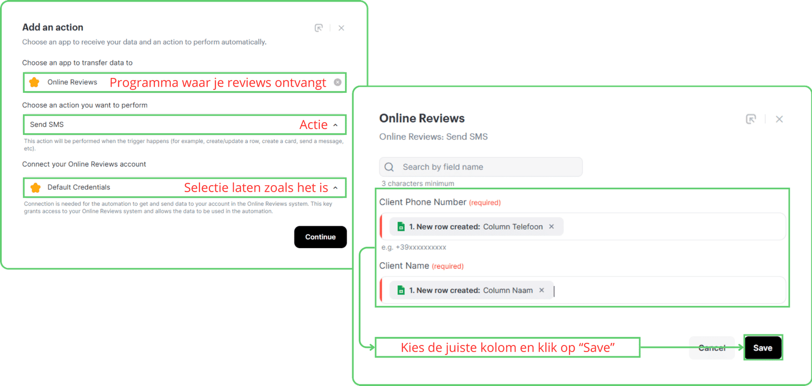 Daarna: Zal een pop-up verschijnen “Online beoordelingen”. Hier kies je voor SMS verzenden of E-mail verzenden. Stem de velden af op de overeenkomende velden in je Google Form, afhankelijk van de actie die je hebt gekozen, SMS OF Email. (De afbeelding hieronder toont velden voor SMS).