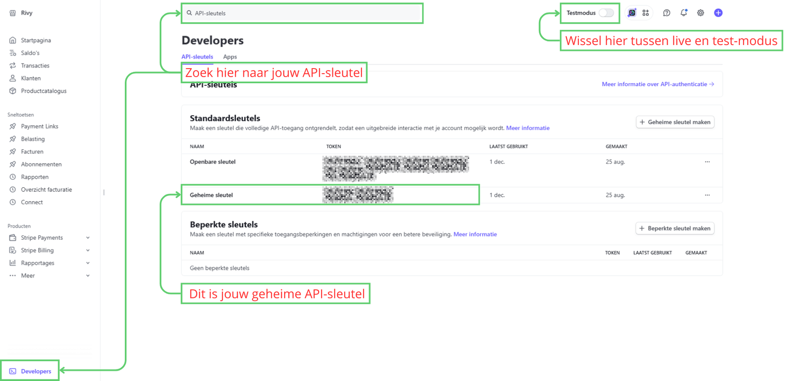 Weet je niet waar je jouw Stripe-sleutel (Secret-Key) kan vinden? klik dan hier.