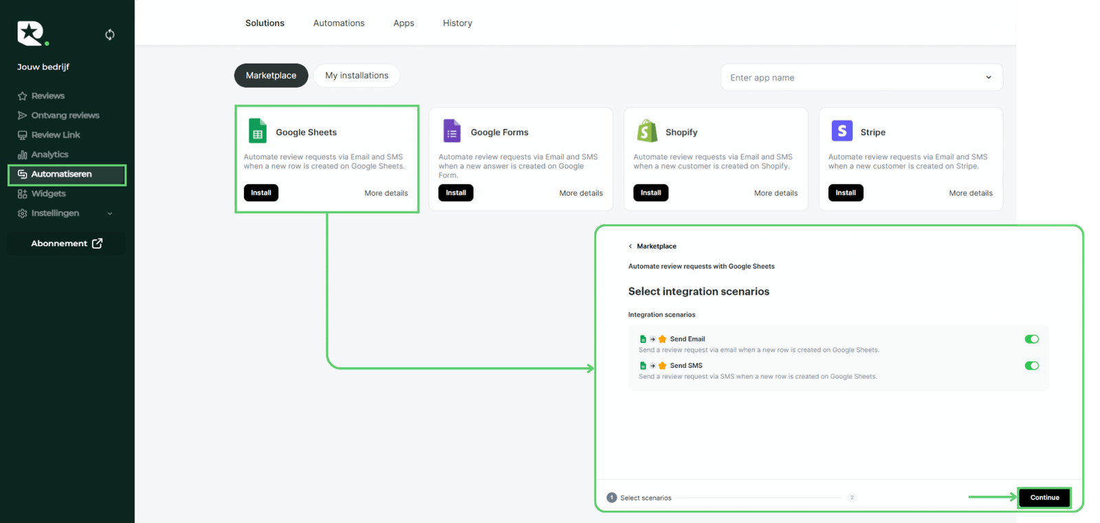 Creëer een automatisering binnen het platform om reviewverzoeken via e-mail of sms te verzenden bij het indienen van het formulier.