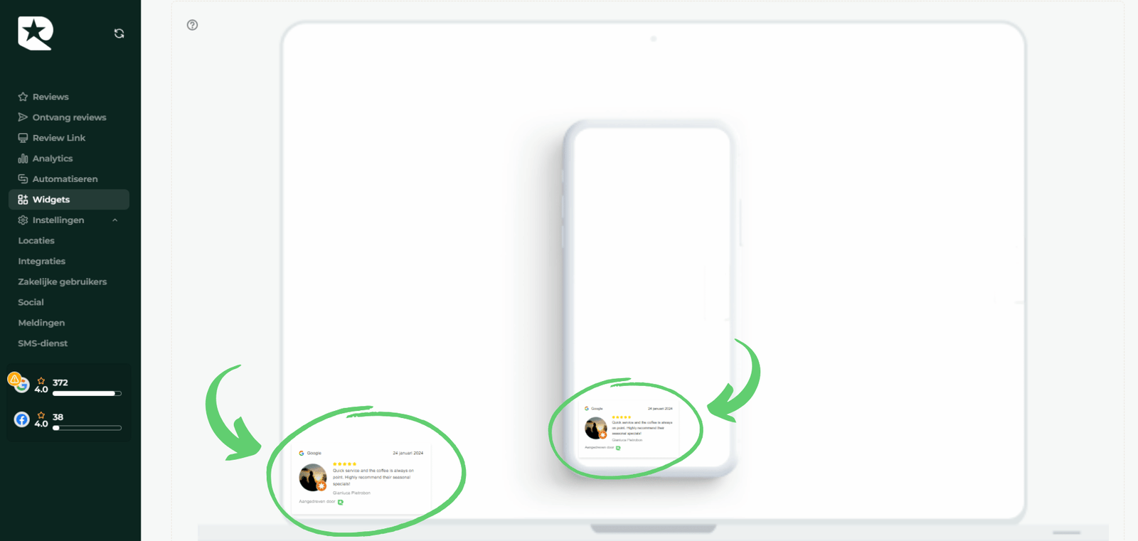 Met een van onze geweldige functies kun je al je positieve reviews laten zien, via 5 verschillende soorten widgets die je kunt toevoegen aan je website of gewoon door je sociale accounts te integreren en positieve reviews rechtstreeks op Instagram of Facebook te plaatsen.