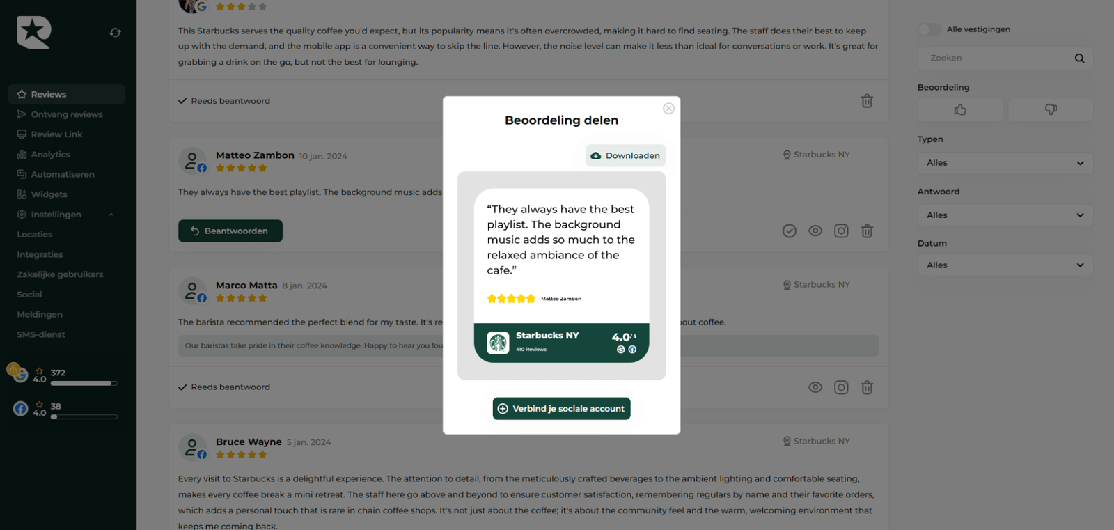 Zodra je je sociale platforms hebt geïntegreerd, ga je gewoon naar het dashboard, zoek je de review die je wilt delen en klik je op “Delen op sociale media”. Selecteer de sociale platforms waarnaar je de review wilt delen en klik op “delen”.